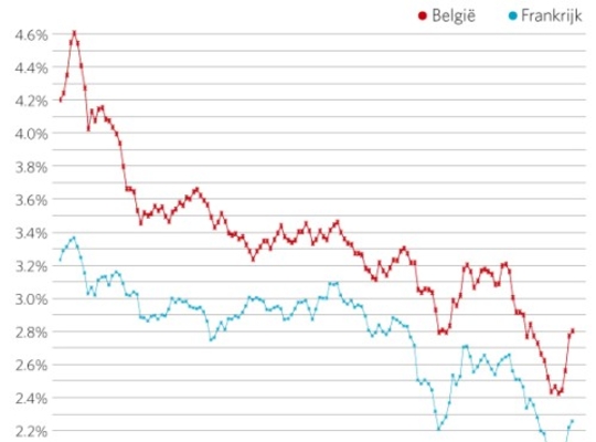 Het vraagstuk werd vandaag opgelost door Johan Van Overtveldt, hoofdredacteur van Knack en Trends, ook nog topeconoom. Het blijkt dat de langetermijnrente die België aangerekend wordt eigenlijk gewoon die van Frankrijk volgt. Ongeacht welk beleid in België gevoerd wordt (tenzij bij extreme ontsporing).